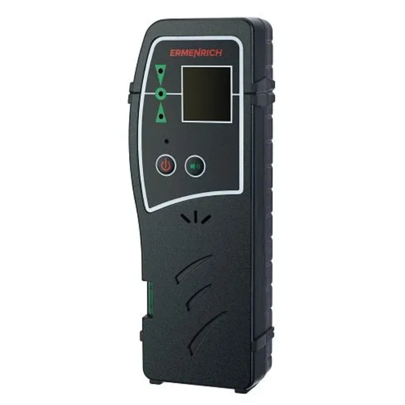 Ermenrich LR30 -это удобный лазерный приемник, который помогает работать с лазерным уровнем там, где сам луч видно плохо: на большой дистанции, в ярком свете или в условиях, когда глазом его не различить. Прибор фиксирует положение луча на расстоянии до 50 метров и работает как с зелёными, так и с красными лазерами. На корпусе расположены световые индикаторы и два пузырьковых уровня, которые помогают быстро выставить устройство в нужное положение. При необходимости приемник можно закрепить на штативе -в корпус встроен разъём 1/4", а также в комплект входит удобный кронштейн.