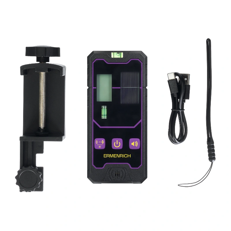 Ermenrich LR20 - это лазерный приёмник, который помогает лучше работать с лазерными уровнями. Особенно когда нужно измерять большие расстояния, работать при ярком свете. лазерный приёмник хорошо определяет зелёные и красные лучи на расстоянии до 50 метров, а также поддерживает два режима точности: точный (прибл. 2 мм погрешности) и обычный (прибл. 3 мм). Когда прибор ловит луч, то сразу сигнализирует об этом, с помощью индикаторов и зуммера. Громкость зуммера можно настроить, а также выключить совсем, если необходима тишина.