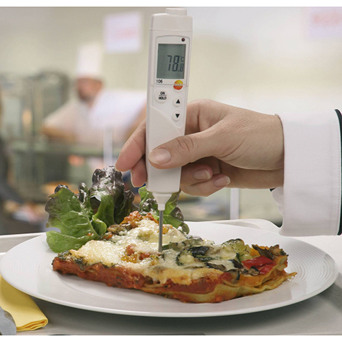 Проникающий термометр testo 106 с тонким и прочным наконечником, идеально подходит для быстрых проникающих измерений температуры продуктов в отелях, ресторанах и супермаркетах.