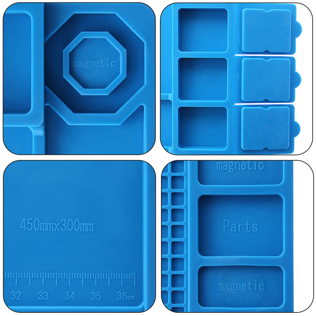 Монтажный коврик предназначен для предотвращения повреждения электро и радиоизделий статитеческим электричеством. Дополнительно в поверхность были установлены 4 магнита для надёжной фиксации металлосодержащий элементов и комплектующих. Имеются 3 лотка с крышками.