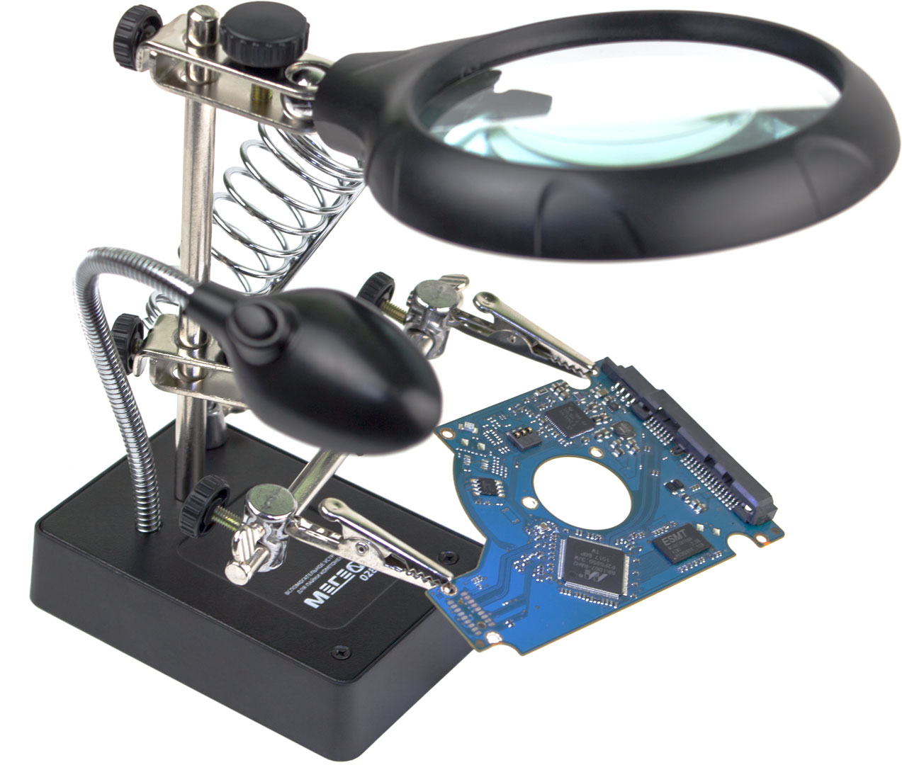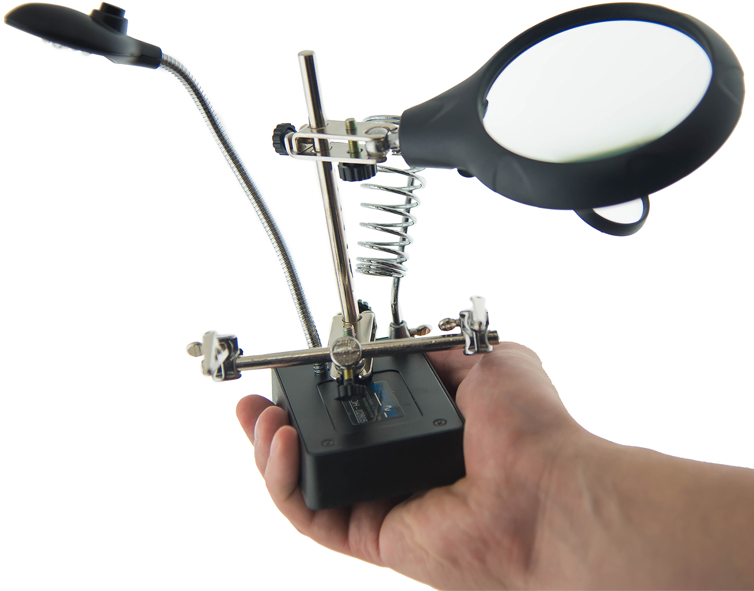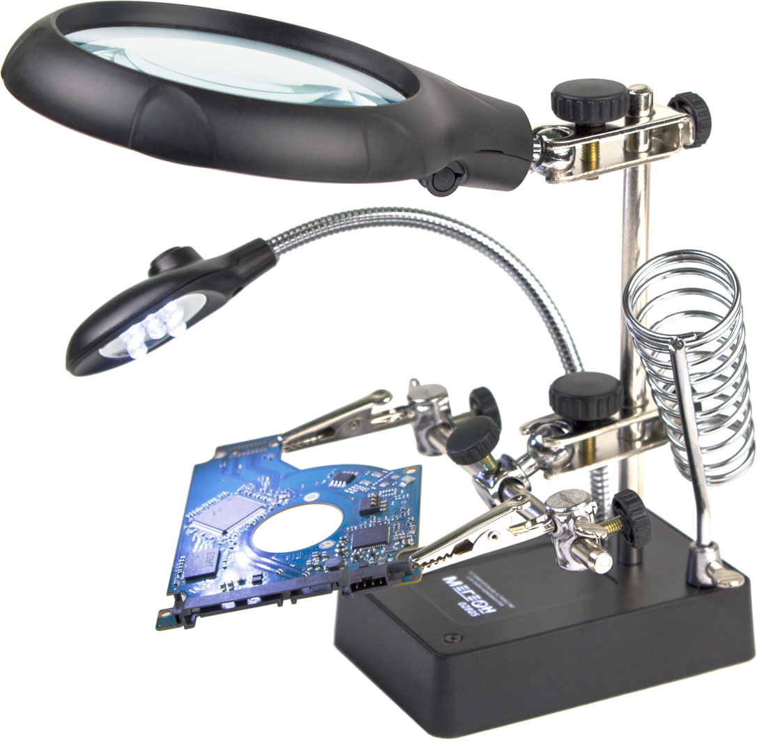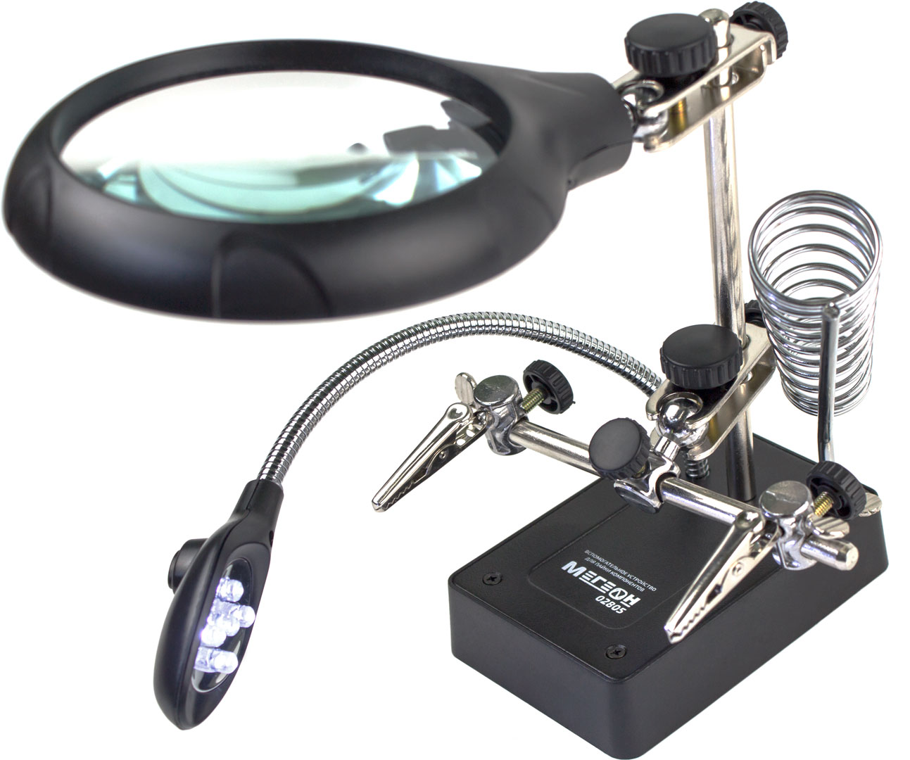 Вспомогательный инструмент "третья рука". LED подсветка на гибкой стойке. Три линзы. Диапазон увеличения линз 2,5; 7,5; 10. Возможность комбинирования двух линз. Держатель паяльника. Автономная работа.
