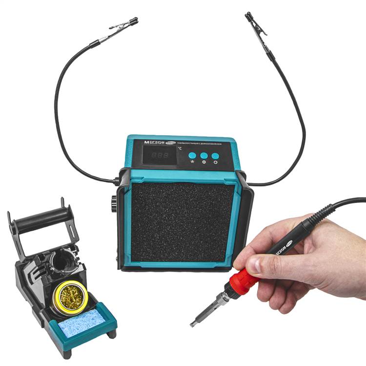 Паяльная станция МЕГЕОН 00348 сконструирована для экономии места на рабочем столе за счет объединения дымоуловителя и мощного паяльника.