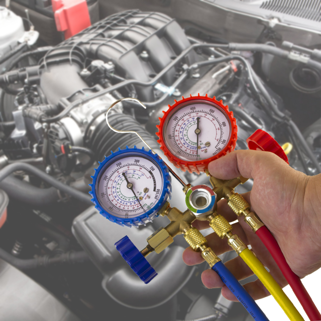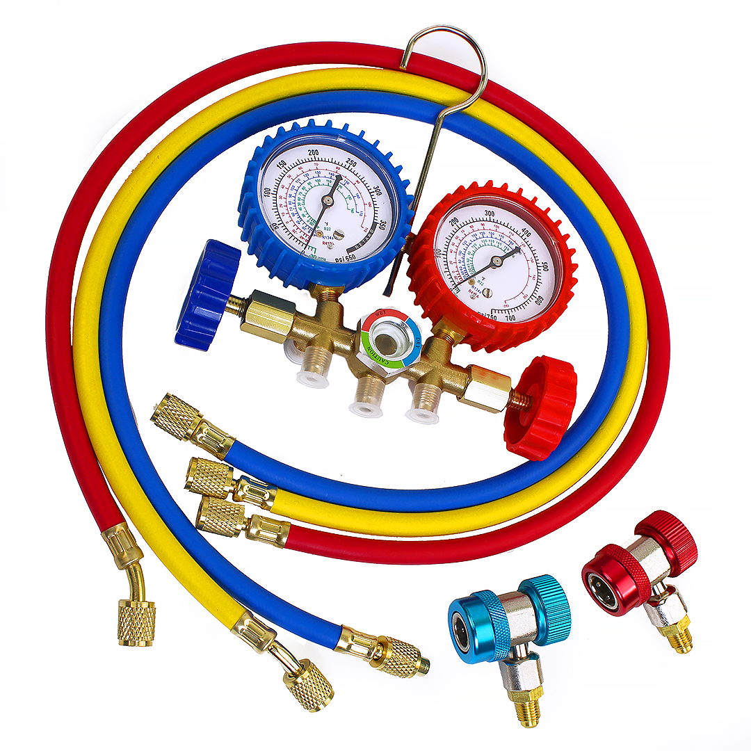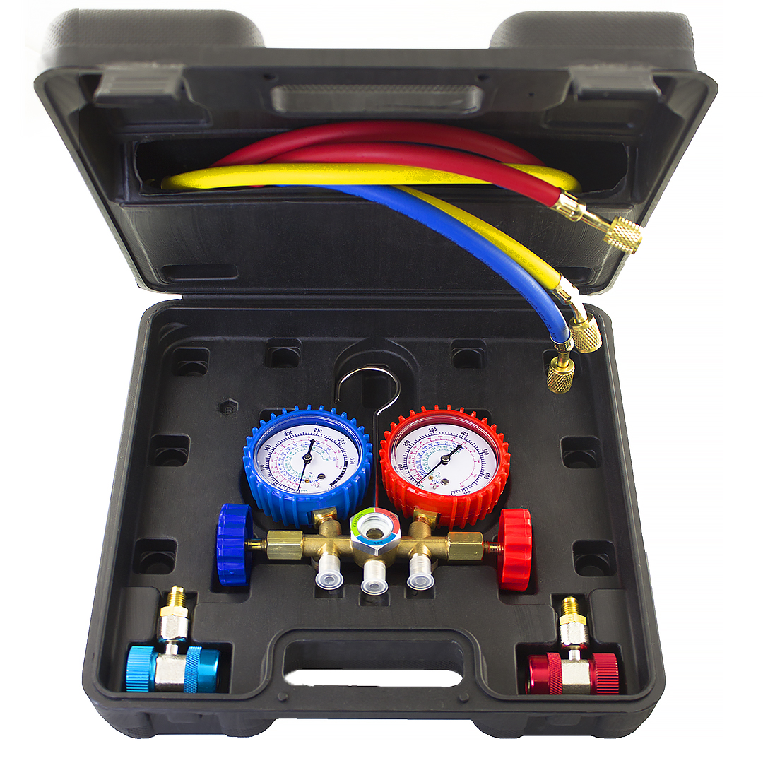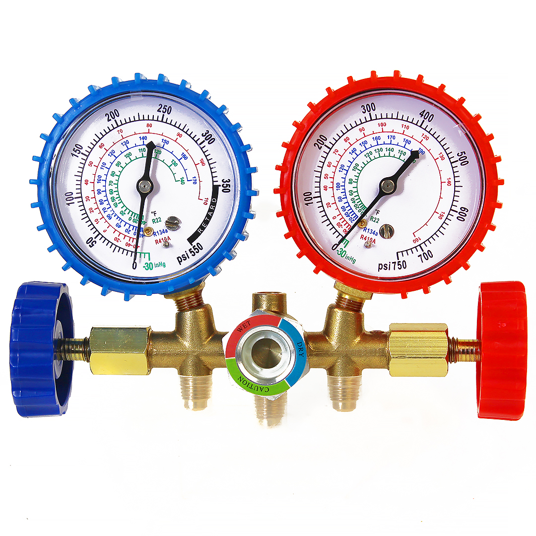 Манометрическая станция (коллектор), имеющая два манометра, 2 вентиля, три штуцера и смотровое окно. Позволяет одновременно измерять давление в обоих контурах, проводить вакуумирование, заправку и дозаправку хладагентом. На шкалах нанесены температуры кипения хладагентов R22, R404a, R410a.