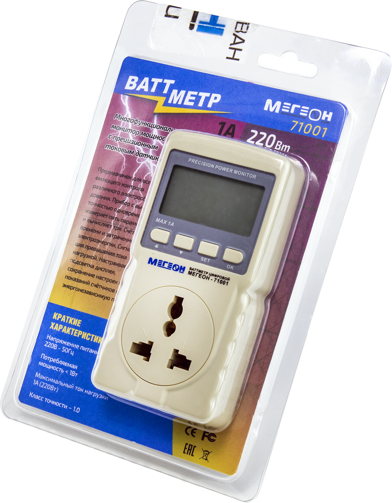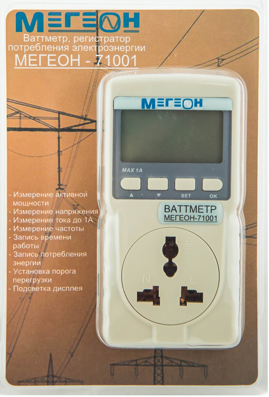 Ваттметр Мегеон 71001 представляет собой современное устройство для измерения параметров активной мощности и потребления электроэнергии. Прибор оснащен ярким ЖК-экраном с подсветкой, позволяющим без труда считывать показания даже в условиях низкой освещенности.