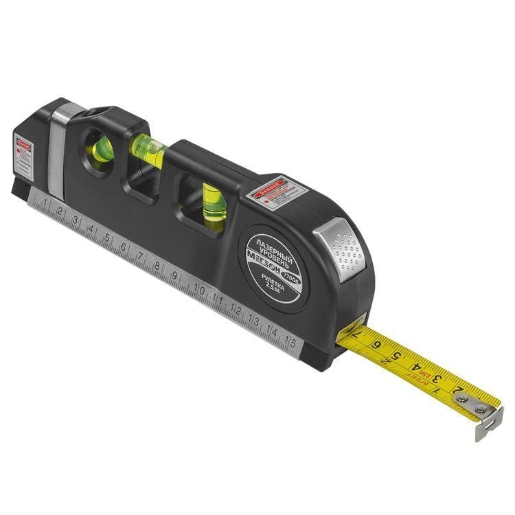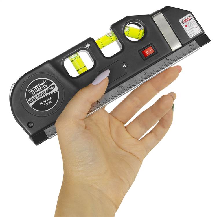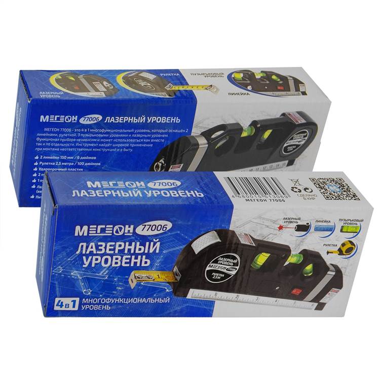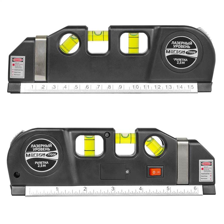 МЕГЕОН 77006 – это многофункциональный инструмент "4 в 1", который оснащён линейкой и рулеткой с двойной оцифровкой, тремя пузырьковыми уровнями и лазерным осепостроителем, что улучшает его потребительские свойства.