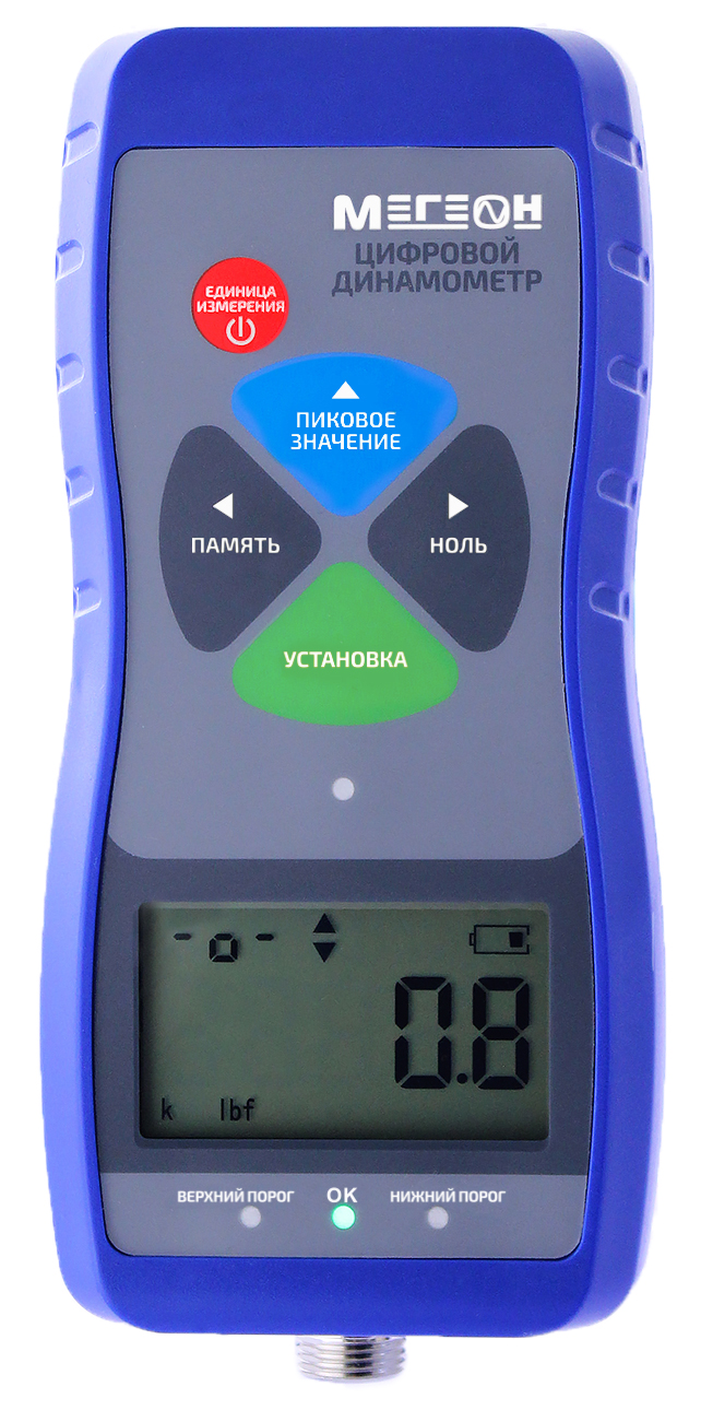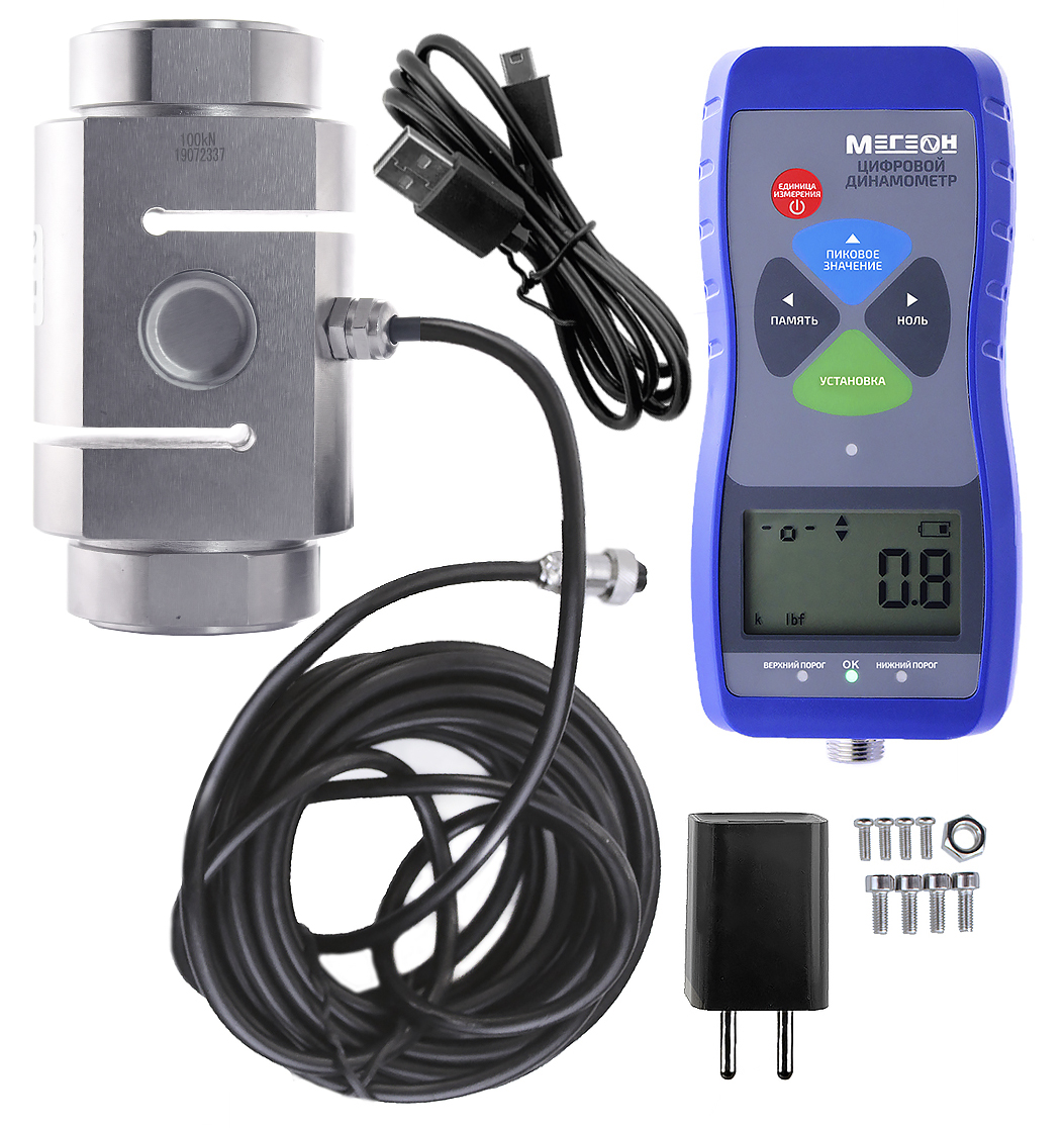 Фиксация пиковых значений; Встроенный литий-ионный аккумулятор; Память на 999 измерений; Вычисление минимального, максимального и среднего значений; Три единицы измерения; USB-порт для зарядки и связи с ПК; ЖК-дисплей с подсветкой; Управление внешними устройствами.